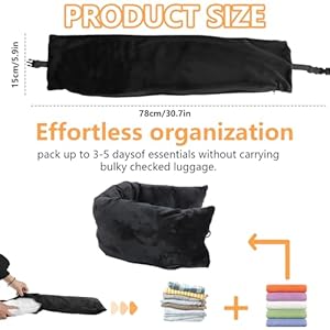 ✈️Facile da usare: Il Cuscino da Viaggio Riempibile adotta un design autoriempitivo, che può essere riempito con vestiti da entrambe le estremità, sfruttando appieno lo spazio esistente e riducendo i bagagli ingombranti.Può essere utilizzato come bagaglio a breve distanza borsa e cuscino da viaggio.La tracolla regolabile può essere utilizzata anche in diagonale.Portalo in spalla o in valigia.