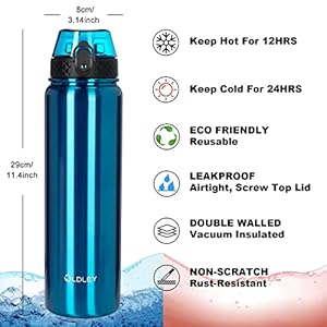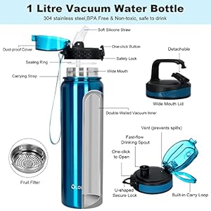 Tenete l’acqua calda per 12 ore o fredda per 24 ore. – Questa borraccia da 1 litro in acciaio inox a doppia parete è realizzata in acciaio inox 18/8 (304), 100% senza BPA, atossica, senza sudore, senza gusto metallico o gusto strano. La funzione a doppia parete impedisce la condensa e le scottature e mantiene la temperatura della vostra bevanda. Goditi tutti i tipi di bevande fresche e fresche in estate, goditi il calore in inverno freddo.