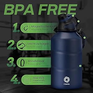 🌊 Materiale di qualità alimentare: la borraccia sportiva FJbottle, insapore e inodore, è realizzata in acciaio inox alimentare 304, resistente alla corrosione e all’ossidazione e naturalmente priva di BPA, BPS e ftalati.