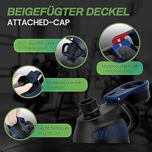 🌊 Design unico: questa borraccia sportiva ha un coperchio magnetico che non tocca il naso quando si beve. Grazie al tappo a vite integrato nel coperchio, il design è ancora più ecologico e pratico.