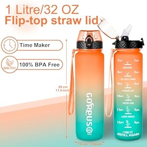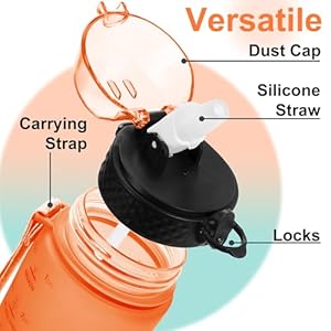 Questa bottiglia è dotata di un coperchio in cannuccia ribaltabile, progettato semplicemente con una serratura sicura, che lo rende privo di polvere e a prova di perdite. per uso con una sola mano. Con un foro d’aria per un flusso fluido e uniforme, senza spremere, SICURO E QUALITÀ PREMIUM Realizzato in plastica priva di ftalati, non tossica, priva di BPA e salutare per l’acqua potabile quotidiana. Perfetto per bambini in età scolare o adulti, escursionismo, ciclismo, campeggio, corsa o qualsiasi altro sport a casa o all’aperto. BOTTIGLIA D’ACQUA con CINGHIA DA TRASPORTO Fornita con coperchio in cannuccia e tracolla con anello per il collo, facile da portare ovunque tu voglia, scelta regalo ideale per te, amici, familiari, colleghi, donne e uomini che amano uno stile di vita sano. BOTTIGLIA D’ACQUA MOTIVAZIONALE Con una citazione motivazionale unica, volume d’acqua e indicatori di tempo su di essa, ti aiuta a monitorare l’assunzione di acqua e ti ispira a raggiungere i tuoi obiettivi quotidiani.