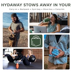 Non sprecare spazio: prova a trovare una bottiglia d’acqua più pieghevole di HYDAWAY – non lo farai! Crollando da una capacità dissetante da 708,7 g a un profilo sottile da 3,8 cm in pochi secondi, puoi sorseggiare e riporre le tue bottiglie d’acqua ricaricabili e continuare