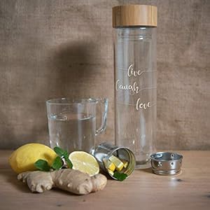 Navaris Bottiglia Termica Acqua Detox 500ml – Borraccia in Vetro con Filtro – Termos tè infusi Tisane – Coperchio bambù e Custodia – Live-Laugh-Love