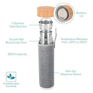 DETTAGLI: 1x borraccia termica in vetro borosilicato infrangibile da 0,5l (7×25,5cm), 1x setaccio in acciaio con tappo, 1x coperchio in bambù, 1x custodia in neoprene. Resistenza termica compresa tra -20°C a 150°C.